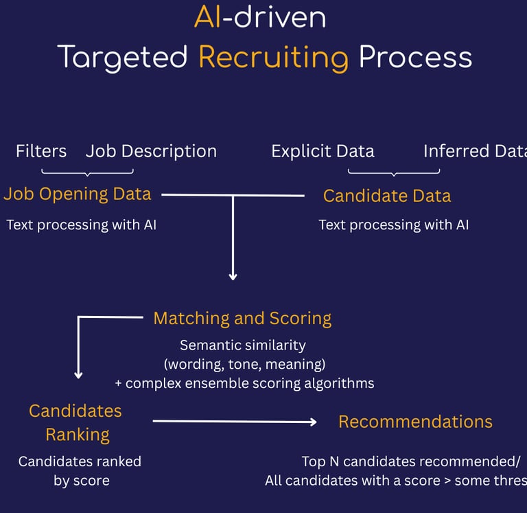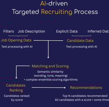 Platforms making targeted recruiting seamless are heavily reliant on data collection and AI. When a recruiter provides a job description the expectation is to get a ranked list of the most suitable candidates. Below is an illustration of the process behind the scenes.